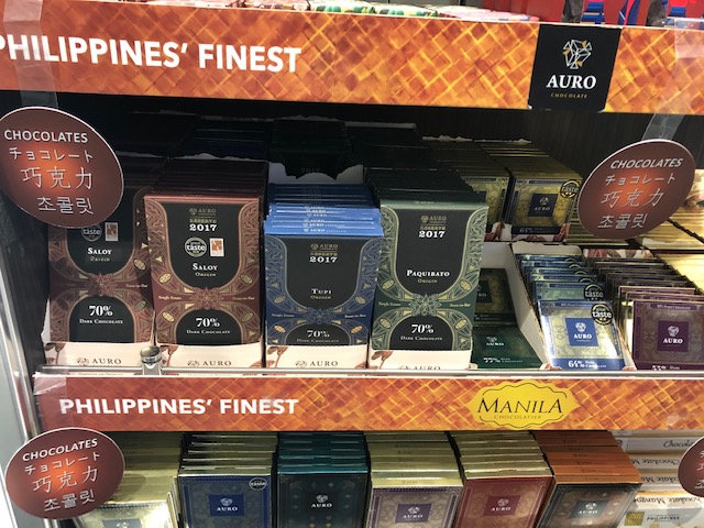 I was very happy to see that the best of Philippine chocolates are being sold at the duty free shop. These include Malagos (the Davao brand, which I think is the top quality chocolate in the country), Auro (also from Davao and with high quality comparable to Malagos), and Theo & Philo (another good quality chocolate). At the bottom of the shelf are high quality liquor.
