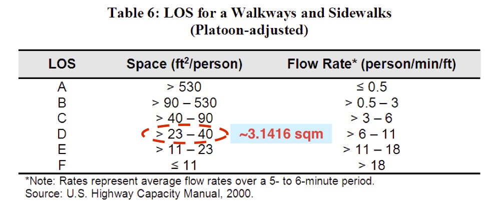 I was reviewing materials for my classes now that the latter have been suspended and we are switching to online teaching. I came upon the topic of level of service (LOS) for pedestrians – for walkways and sidewalks to be exact. Following is the LOS table for walkways and sidewalks (platoon-adjusted) with my note, and an illustration of walkway LOS thresholds with my annotations. The recommended minimum social distance is 1 meter. That translates to a space of 3.14159 square meters if we assume a circular area around a person.