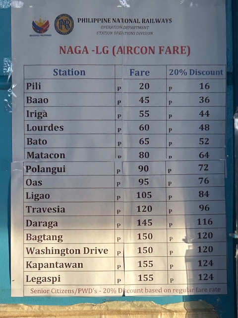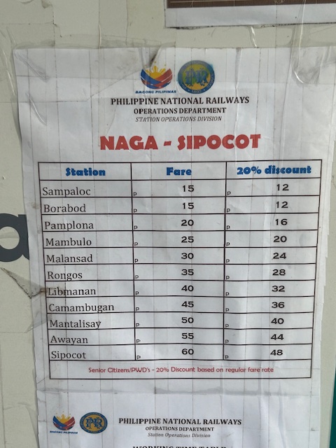 Timetable between Naga and Sipocot. It takes 1 hour and 12 minutes one way. It seems I wasn’t able to take a photo of the Naga-Legazpi timetable but the staff told us it takes 3 hours to get to Legazpi.