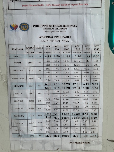 We went to the PNR Naga Station last Friday morning and got an updated timetable for the PNR trains. We also were informed that the Naga-Legazpi train service is currently suspended due to damages along the line sustained during the recent typhoon. Hopefully, that section will be repaired immediately and the service resumed.