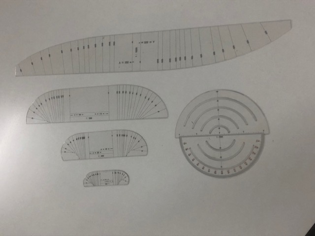 Some of the instruments from the case – the large one on top is for A = 300m and 350m (scale 1:1000)
