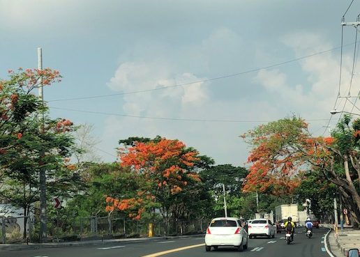 My regular commute between my home and my workplace typically has 5 alternative routes with three taking me to Sumulong Highway. While night-time travels aren’t at all noteworthy, daytime travel especially from home to office provides for some nice views of the city. Along the highway, though, there are also some nice sceneries especially this time of year when the fire trees are in full bloom. Here’s a photo along Sumulong Highway showing some of the fire trees along its stretch.